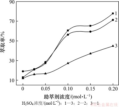 由图2可知:在硫酸介质中,锑的萃取率都是随着助萃剂A浓度的增加而不断提高,符合前面所述规律。