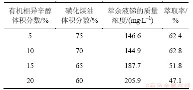 在水相料液锑的质量浓度为389.5 mg/L,硫酸浓度为3 mol/L,助萃剂A浓度为0.1 mol/L,相比为1:1,震荡时间为5 min,固定有机相中萃取剂N235体积分数为20%的条件下,改变有机相中改质剂异辛醇的体积分数,考察异辛醇的体积分数对锑萃取率的影响,结果如表2所示。
