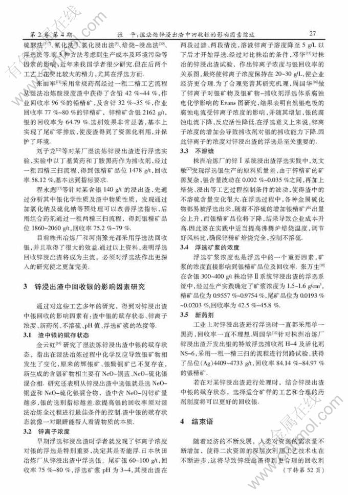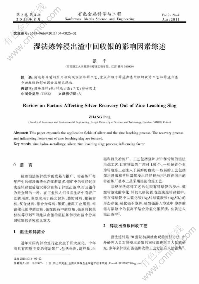 Key words:zinc hydro-metallurgy; silver; zinc leaching slag; process; influencing factor