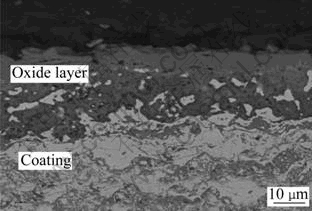 Cross-sectional SEM micrograph of the coating after 50 h exposure at 800 ℃ is presented in Fig.3. A thin oxide layer with a thickness of about 5 μm is observed on the coating. Microscopic observations show that the oxide layer is continuously attached to the underlying coating, and the coating is intact with no signs of delamination or cracking.
