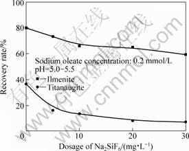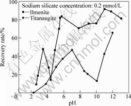 捕收剂油酸钠浓度为0.2 mmol/L,在弱酸性条件下影响的,对钛铁矿及钛辉石进行抑制剂试验。选用的抑制剂为氟硅酸钠和水玻璃两种。
