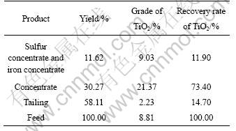 2) 在pH为5.5~6.0的弱酸性范围内,采用DOB为捕收剂,水玻璃为抑制剂,可以从含TiO2品位8.81%的实际矿石中分离出TiO2品位为21.37%的精矿,尾矿中TiO2品位可降至2.23%,TiO2的回收率为73.40%,可实现微细粒钛铁矿的分离。