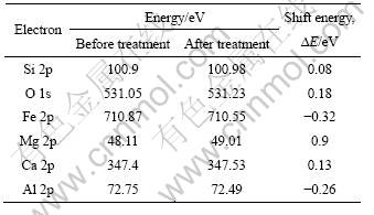 矿物表面Si与O、Al、Fe、Mg和Ca质量浓度的变化将直接反映这些金属离子的变化情况。从表3可以看出,与水玻璃作用后,Si和O原子的浓度有了明显增加,而其它金属原子的浓度有了较小幅度的降低,充分说明水玻璃在钛辉石表面有了吸附。同时,造成了钛辉石表面Fe、Mg、Ca、Al原子浓度的降低,这与表3所得的结果相吻合。