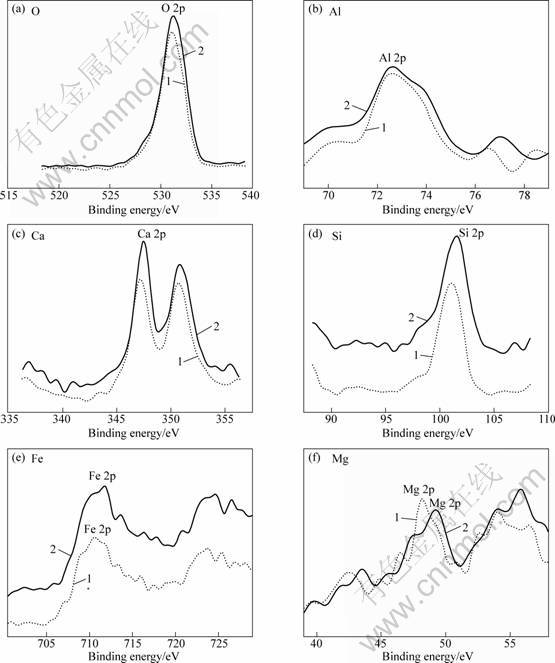 Fig.6 XPS spectra of elements of titanaugite before (1) and after being (2) treated with 10 mg/L water glass at pH value of 6.0