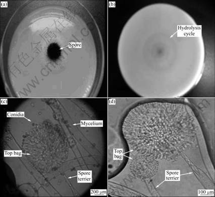 Fig.1 Morphological features of strain HB-01: (a) Colony formed on PDA for 5 d; (b) Colony formed on solidified selected medium for 5 d; (c), (d) Microscopic morphologies