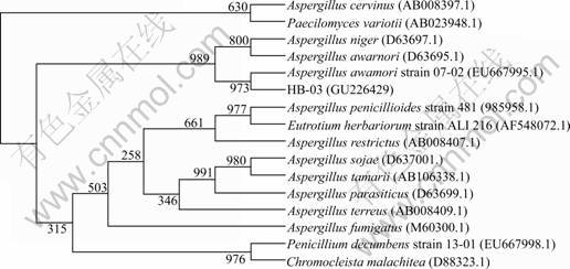 Fig.2 Phylogenetic tree for strain HB-03 and relative strains based on 18S rDNA gene sequence