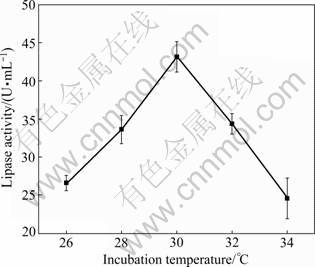 The lipase activity was determined using p-nitrophenyl palmitate (p-NPP) as substrate according to WINKLER and STUCKMANN [10] with some modification. In brief, solution A consisted of 90 mg p-NPP dissolved in 30 mL HPLC grade iso-propanol, then stored at -20 °C immediately, and solution B contained 0.4% (v/v) Triton X-100 and 0.1% (w/v) gum arabic dissolved in 0.05 mol pH 8.0 Tris-HCl buffer. The reaction mixture with 0.5 mL solution A and 4.5 mL solution B was pre-incubated for 5 min at 37 °C. Then, 0.05 mL enzyme was added into the reaction mixture and incubated for 10 min at 37 °C in a shaking water bath, which was terminated by the addition of ethanol. And the inactivated enzyme, which was heated at 100 °C for 5 min, was used as control following the same procedure. Finally, the lipase activity was detected at 410 nm with spectrophotometer. One unit of lipase was defined as the amount of enzyme, which liberates 1.0 μmol p-nitrophenol (p-NP) from p-NPP per minute under standard assay conditions.