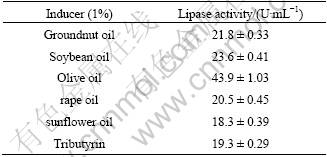 The effect of different inducers on lipase production was studied. As the results (Table 1) indicated, the maximum lipase activity ((43.9±1.03) U/mL) was obtained with olive oil as the inducer. Groundnut oil and soybean oil were also proved to be fine inducers for lipase production of A. awamori HB-03. Similarly, til and olive oils were used for lipase production by A. niger NCIM1207 and the maximum yields of lipase activity were obtained [16]. However, inducers except olive oil cannot enhance lipase production of A. niger [17].