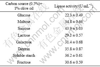 As we know, different carbon sources have different effects on the enzyme production. Glucose, maltose, sucrose, lactose, galactose, dextrin, soluble starch and fructose were tested as carbon sources at 0.5% in media supplemented with 1% olive oil. As Table 2 indicated, all carbon sources could enhance the lipase production except glucose. The highest lipase production ((43.9±1.03) U/mL) was observed with sucrose as the carbon source. However, sucrose was reported to have no significant influence on the lipase production by A. niger [17]. Generally, microorganisms can produce high yields of lipase when carbon sources are used. Bacillus cereus C7 produced lipase when the medium contained 2% starch as carbon source [18]. Fructose and glucose were reported to be the best carbon sources for lipase production by Amycolatopsis mediterranei DSM 43304 and Candida cylindracea, respectively [19-20].