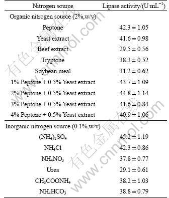 In general, nitrogen source is one of the most critical factors for lipase production. It can be observed from the results that the lipase activity ((44.8±1.14) U/mL) of strain HB-01 was obtained with 2% peptone and 0.5% yeast extract as organic nitrogen sources in the medium (Table 3). Similarly, many reports showed that peptone and yeast extract significantly enhanced lipase production [20-21]. It can also be seen from the results that (NH4)2SO4 was the best inorganic nitrogen source which could significantly increase the lipase production of strain HB-01. But urea was found to inhibit the lipase production. However, urea was reported to enhance lipase production from Rhodotolura glutinis [22].