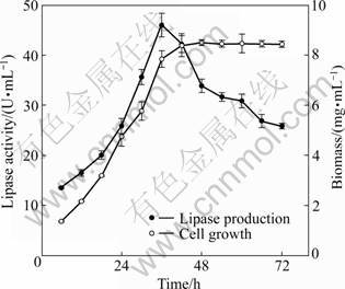 The time courses of lipase production and cell growth were investigated at the optimal culture parameters. As Fig.5 showed, the growth of strain HB-03 got into the exponential phase after 18 h and reached stationary phase after 42 h. It could also be observed from the results that alkaline lipase production increased quickly at the exponential phase and achieved the maximum yield at the end of the exponential phase, then declined rapidly. The optimum lipase production of (45.9±2.3) U/mL was observed during the late exponential phase and beginning of the stationary phase at 36 h. It was reported that the highest lipase production of Rhizopus rhizopodiformis S1 was obtained after 72 h cultivation, then the lipase production decreased, companied with the biomass increasing [23].