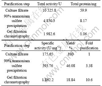 The result of the purification of extracellular lipase from A. awamori HB-03 is shown in Table 4. After two steps of purification, the lipase exhibited 1 862.2 U/mg specific activity and 10.6-fold purification with a yield of 18.84%.