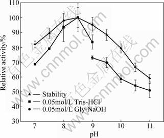 The effect of pH on enzyme activity was determined by measuring the enzyme activity at pH from 7.0 to 11.0. The buffers used were 0.05 mol/L Tris-HCl (pH 7.0-9.0), 0.05 mol/L Gly-NaOH (pH 9.0-11.0). The pH stability was obtained by measuring the relative activity of enzyme after 60 min of pre-incubation in 0.05 mol/L buffers of various pH values (7.0-11) at 37 °C.