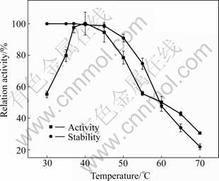 The effect of temperature on the activity of the lipase was determined by assaying the relative enzyme activity at different temperatures from 30 to 70 °C with Tris-HCl buffer (0.05 mol/L, pH 8.5). The thermal stability of lipase was measured at different temperatures from 30 to 70 °C for 60 min with pH 8.5, 0.05 mol/L Tris-HCl buffer.