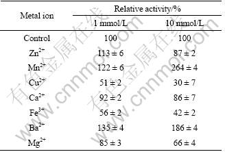 The effects of various metal ions (1 mmol/L and 10 mmol/L ) such as Ca2+, Mg2+, Zn2+, Mn2+, Cu2+ and Fe3+ were determined by being pre-incubated with the lipase for 60 min and then the residual lipase activity was measured.