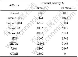 The effects of different factors on lipase were assessed (Table 6). It can be observed that EDTA slightly enhanced the enzyme activity at the concentration of 1 mmol/L, whereas the lipase was inhibited in the presence of SDS, Triton X-100, Triton X-114, Tween 20, Tween 80, urea. And the lipase was strongly inhibited by CTAB losing 80% and 100% of its activity at the concentrations of 1 mmol/L and 10 mmol/L, respectively. It was reported that 0.2% SDS had weak stimulatory effect on lipase activity [18], but no effect was observed on lipase stability of A. mediterranei DSM 4334 at the concentration of 1 mmol/L [19]. Same as the reports on lipases from S. fradiae var. k11, A. mediterranei DSM 4334 and S. rimosus, EDTA had little effect on the lipase activity of strain HB-03 [19, 32-33].