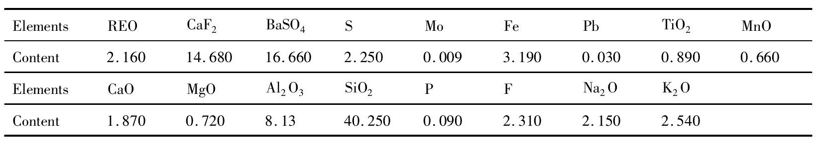 表1中结果表明, 试样中REO品位为2.16%, 略高于稀土矿床原生矿最低工业品位REO1.50%~2.00%的行业标准要求, 则矿样属于低品位稀土矿石。Ba SO4和Ca F2品位均较高, 但未达到独立矿床的最低边界品位要求。由此可知, 该矿样的主要回收成分 (元素) 为REO, 可综合回收Ba SO4和Ca F2, 其他元素含量低, 综合回收意义不明显。