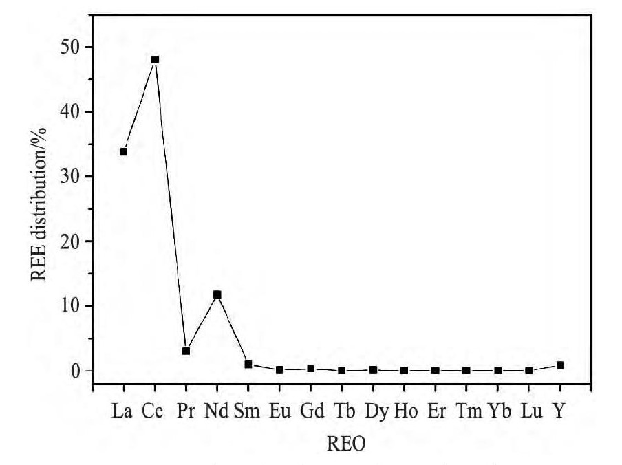 图1中结果表明, 试样中铈、镧和钕为主要的稀土元素, 其中铈+镧配分值高达82.48%。由此表明, 该矿稀土配分属于Ce>La>Nd的富铈强选择配分型;与国外同类型稀土矿相比, 铕和钇等中重稀土元素的配分较高[18]。