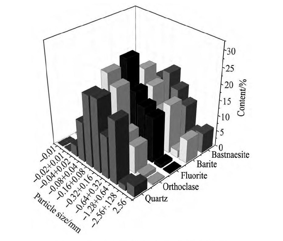 试样中含量最高的5种主要矿物的嵌布粒度测定结果见图2。图2中结果表明, 试样中5种矿物的粒度粗细排序为:氟碳铈矿>正长石>石英>萤石>重晶石。其中, 氟碳铈矿、正长石和石英的粒度相对较粗, 而萤石和重晶石的粒度以细粒和微细粒为主。整体分析, 5种矿物的嵌布粒度均呈现不均匀的特征。