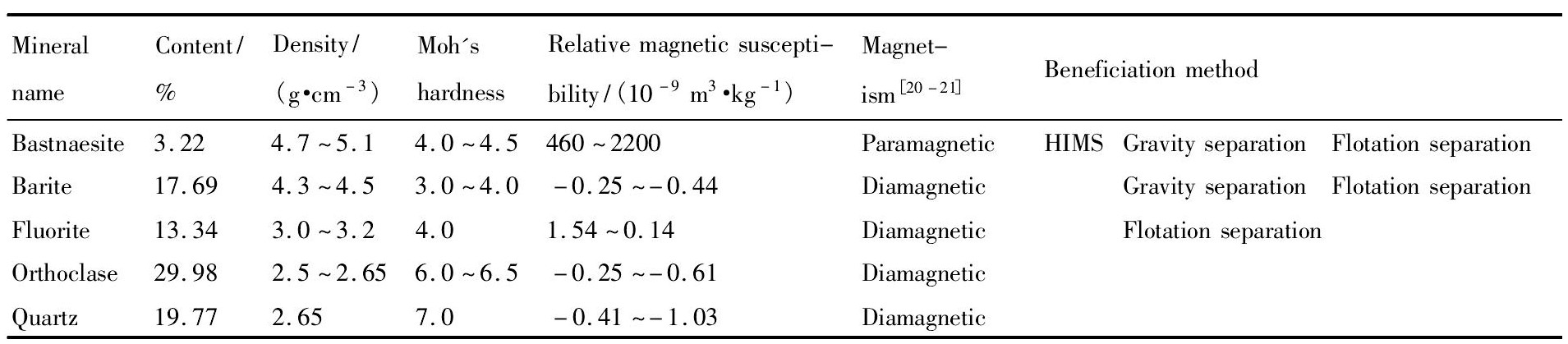 表2中结果表明, 氟碳铈矿与其他主要矿物工艺特性对比, 其弱磁性特征尤为突出, 次之为密度的差异性。这些工艺特性差异, 则是选择与确定选矿工艺流程的基本依据。