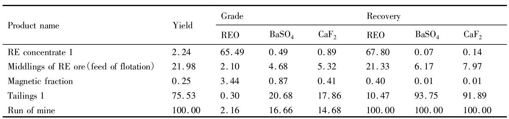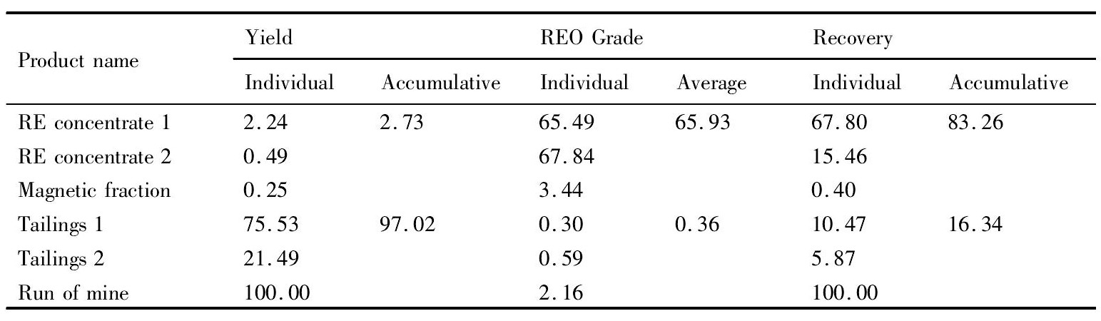 表3 稀土矿的磁重联合工艺流程试验结果Table 3 Test results of magnetic-gravity separation flowsheet for RE ore (%, mass fraction) 下载原图