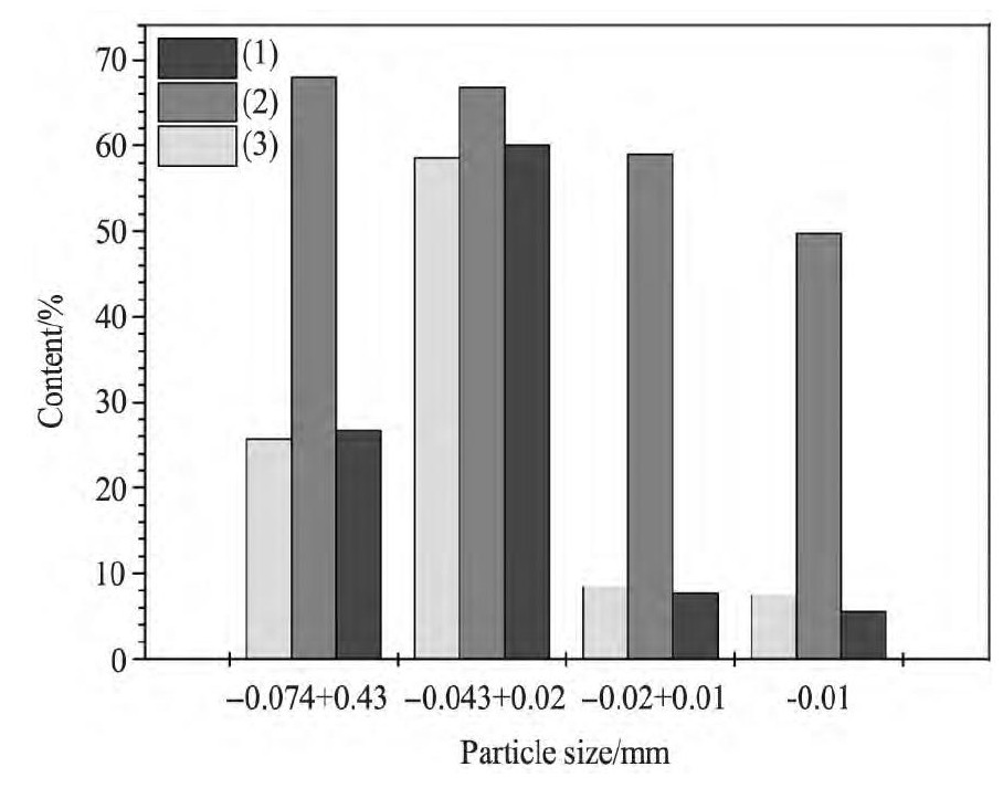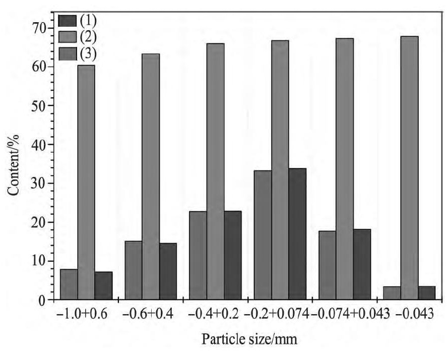 分级实验是通过筛网完成的。将-1.0 mm的试样分别通过0.40和0.074 mm粒级的筛网, 最终分成-1.0+0.4, -0.4+0.074和-0.074 mm3个粒级产品。