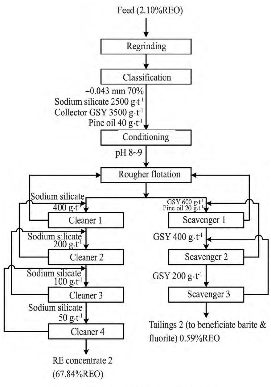 图6 稀土中矿的浮选工艺流程图Fig.6 Flotation flowsheet for middlings of RE ore