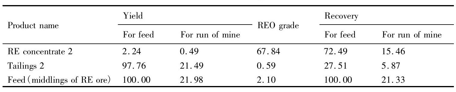 表4 稀土中矿的浮选试验结果Table 4 Test results of flotation flowsheet for middling of RE ore (%, mass fraction)