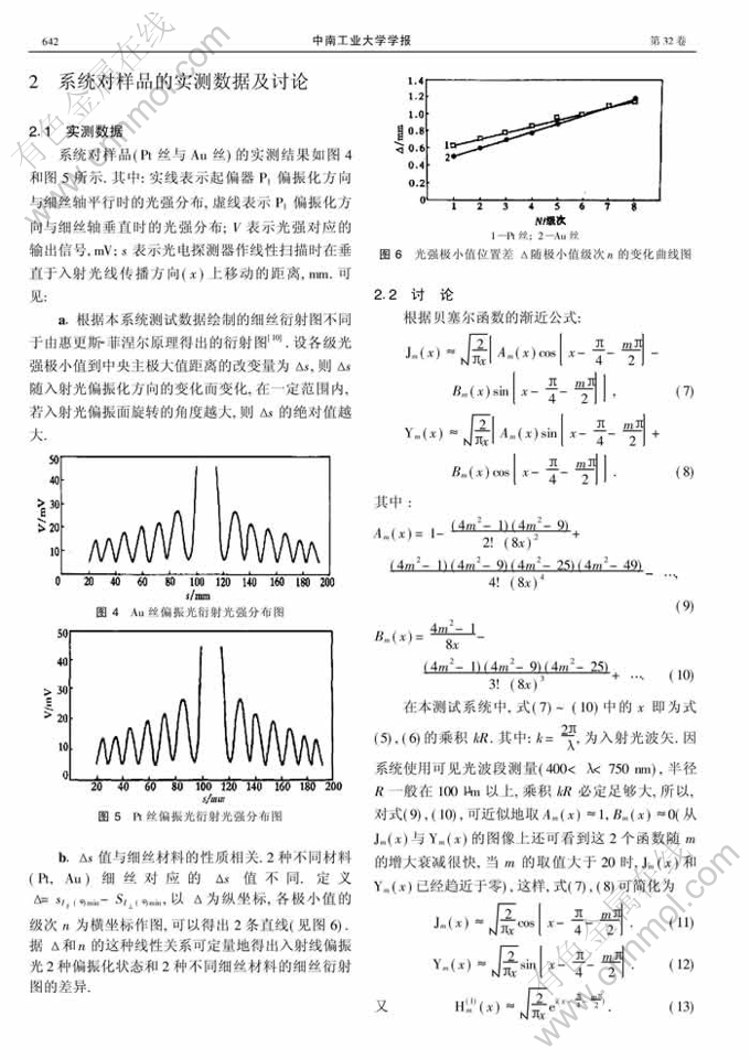 摘 要:椭圆偏振测量是一种具有原子层级灵敏度的无破坏性光学测量技术.作者论证了当入射光波长λ及入射光偏振态确定时,对应于半径为R的细丝,其衍射光强不仅与散射角φ有关,而且与散射场光强分布表现为m阶序列傅里叶变换的序列阶数m有关,因而选择φ和m为测量参数;测量系统在连续采样的每一步进中密集采样,采用对同一数据点进行重复测量取均值的方法提高采样精度;为了提高信噪比,对采样数据用曲线拟合最小二乘法进行二次滤波;对实测数据进行分析,结果表明偏振散射特征及其对散射光场强度分布的影响与散射光在传播过程中偏振度的径向分布有关.