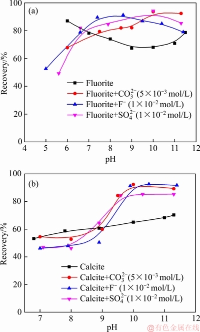 4) 在添加碳酸根离子、氟离子、硫酸根离子的条件下,阴离子可能吸附在矿物表面进而影响矿物的可浮性。