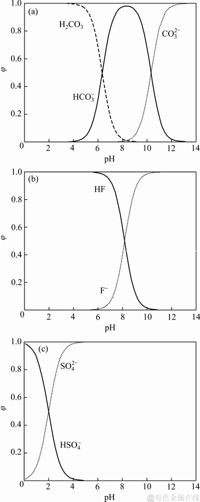 Fig. 3 Aqueous carbonate(a), fluorine(b) and sulfate(c) ions species distribution diagram as a function of pH in solutions open to atmosphere at 25 ℃