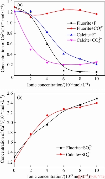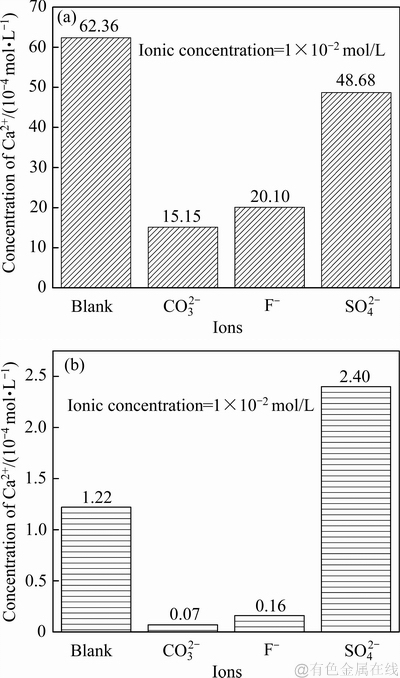 图6 碳酸根离子、氟离子和硫酸根离子对方解石矿浆中Ca2+含量影响