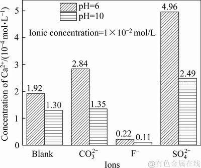 图5 在pH=6和10的条件下,碳酸根离子、氟离子和硫酸根离子对萤石矿浆中Ca2+浓度影响