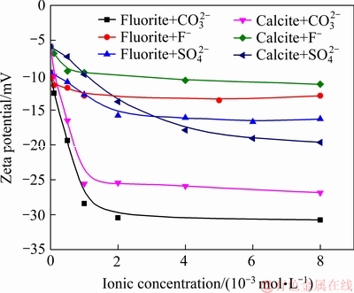 图7 碳酸根离子、氟离子和硫酸根离子对萤石和方解石Zeta电位影响(pH=10)