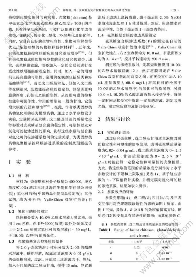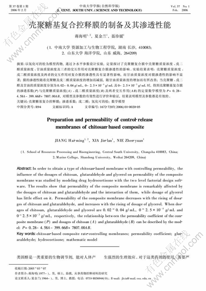关键词:壳聚糖基复合控释膜;渗透系数;戊二醛;氢化可的松;数学模型