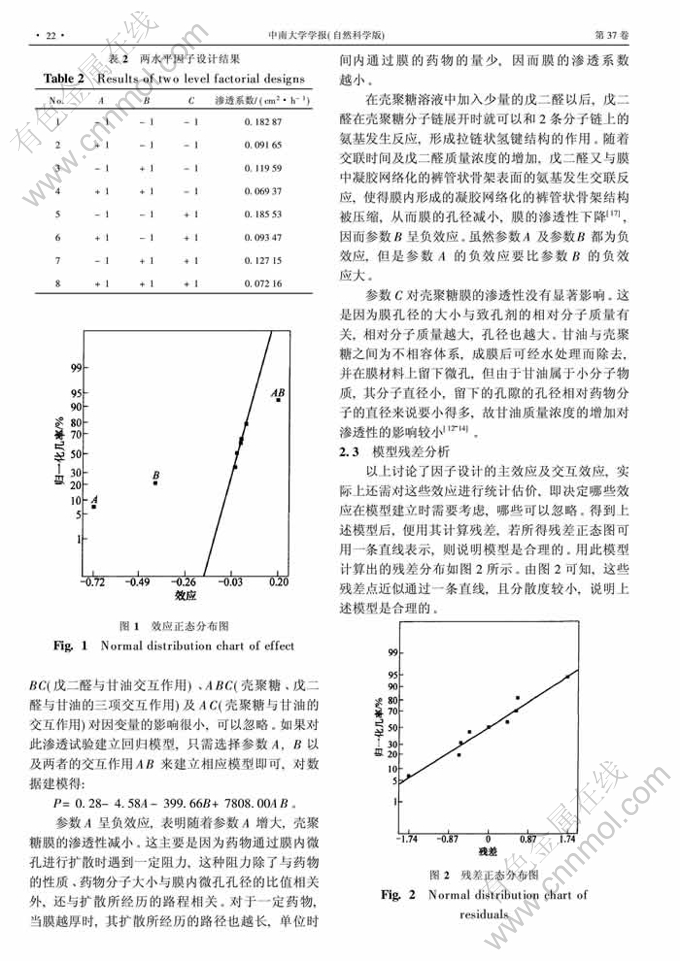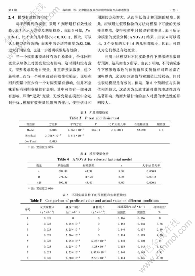 摘 要:以氢化可的松为模型药物,通过2-水平参数设计实验,定量探讨了壳聚糖复合膜中壳聚糖质量浓度、戊二醛质量浓度、甘油质量浓度及三者的交互作用对壳聚糖复合膜渗透性的影响。实验结果表明:壳聚糖质量浓度、戊二醛质量浓度及两者的交互作用对复合膜的渗透性具有显著性影响,而甘油质量浓度对膜渗透性的影响不显著;膜的渗透性随着壳聚糖及戊二醛质量浓度的增加而减弱,随甘油质量浓度的增加而有所改善;当壳聚糖、戊二醛及甘油的质量浓度分别为0.02~0.04 g/mL, 0~2.5×10-4g/mL及0~2.5×10-3g/mL时,得到壳聚糖基复合膜 的渗透系数(P)与壳聚糖质量浓度(A)、戊二醛质量浓度(B)及两者交互作用(AB)的定量数学模型为P=0.28-4.58A-399.66B+7807.00AB,对模型及参数的有效性进行评价和验证,结果表明模型及参数都是有效的。