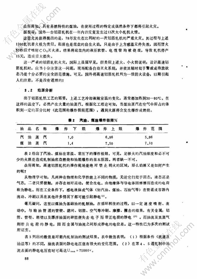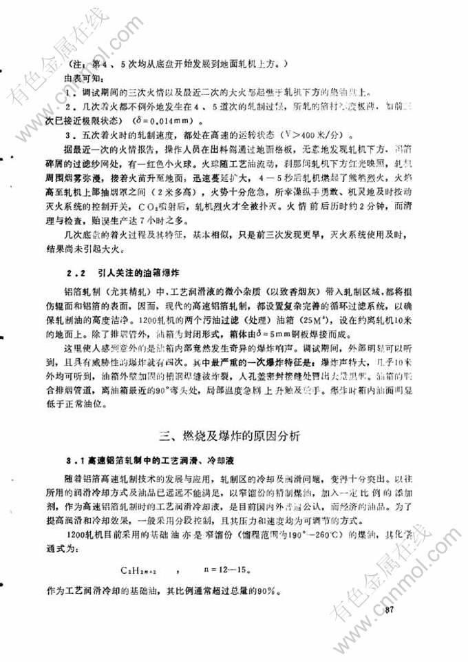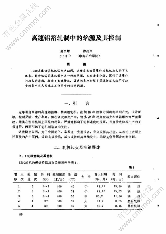 关键词:铝箔轧制; 高速铝箔轧机; 灭火系统; 注意问题; 轧制油; 爆炸极限; 特殊问题; 油箱; 高速轧制; 轧制速度
