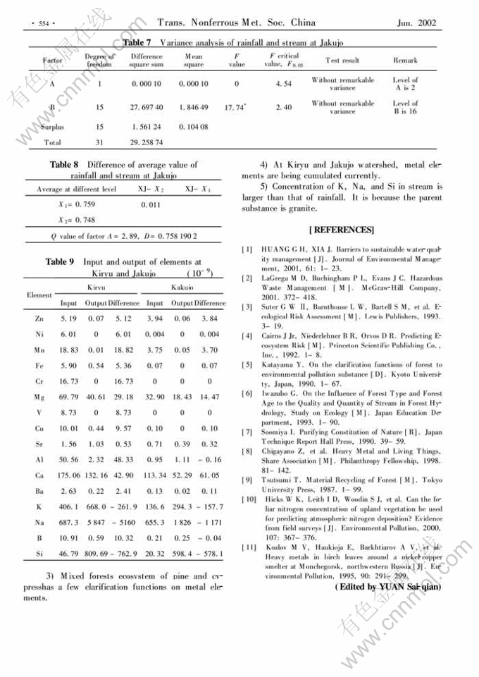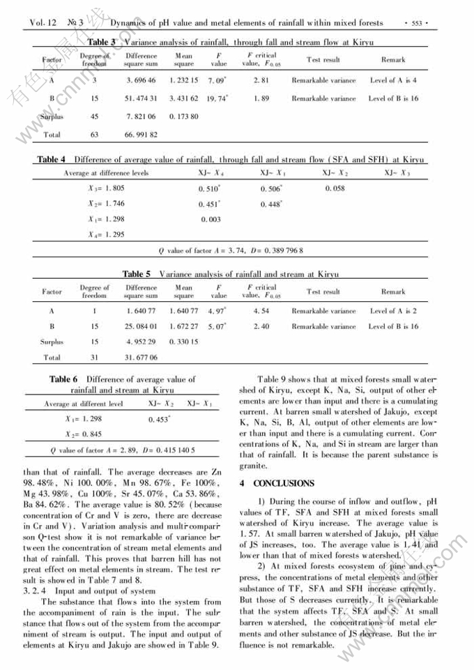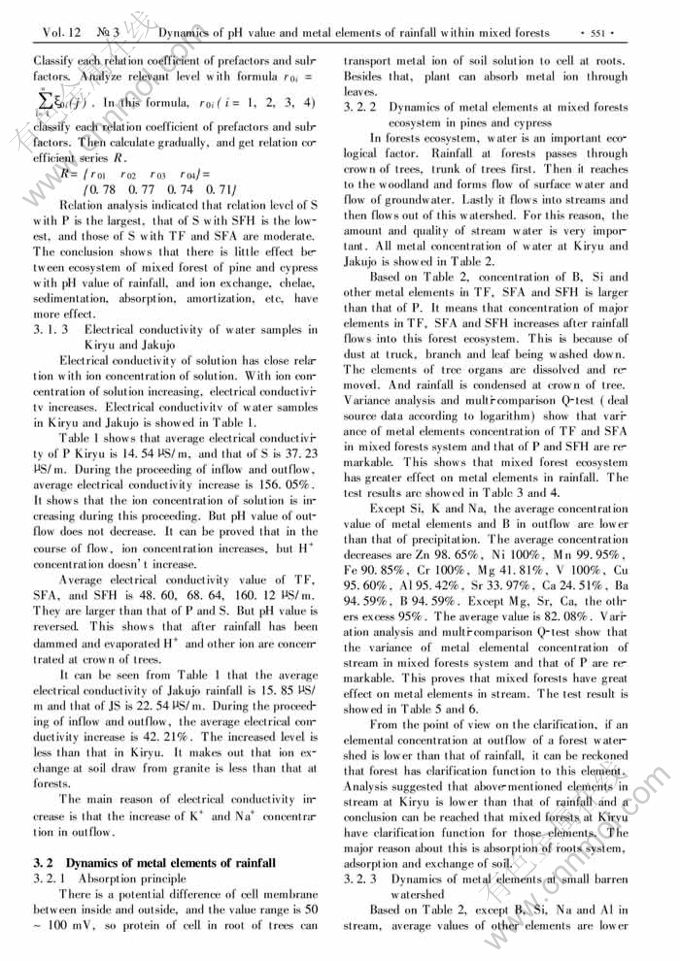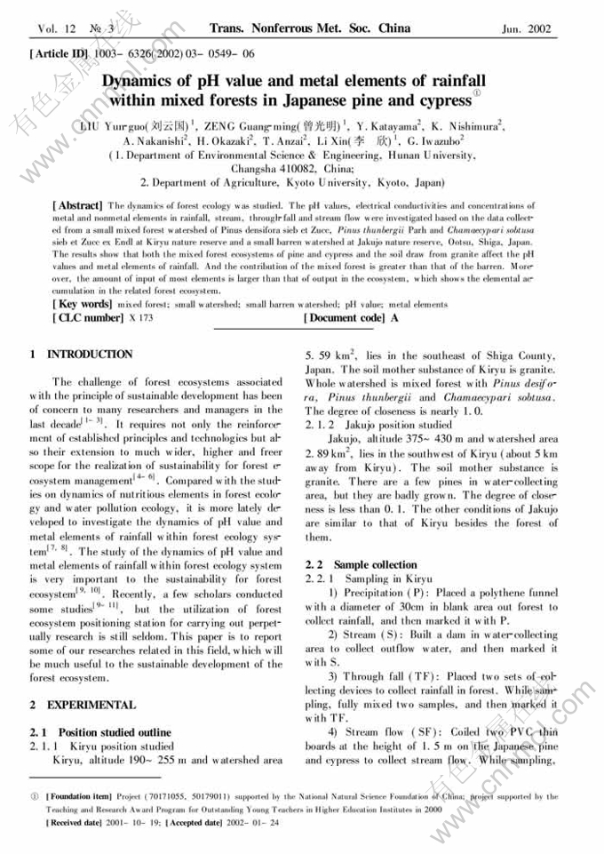 Abstract: The dynamics of forest ecology was studied. The pH values, electrical conductivities and concentrations of metal and nonmetal elements in rainfall, stream, throughfall and stream flow were investigated based on the data collected from a small mixed forest watershed of Pinusdensifor a siebet Zucc, Pinus thunbergii Parh and Chamaecypari sobtusa siebet Zuccex Endlat Kiryu nature reserve and a small barren watershed at Jakujo nature reserve, Ootsu, Shiga, Japan. The results show that both the mixed forest ecosystems of pine and cypress and the soil draw from granite affect the pH values and metal elements of rainfall. And the contribution of the mixed forest is greater than that of the barren. Moreover, the amount of input of most elements is larger than that of output in the ecosystem, which shows the elemental accumulation in the r elated forest ecosystem.