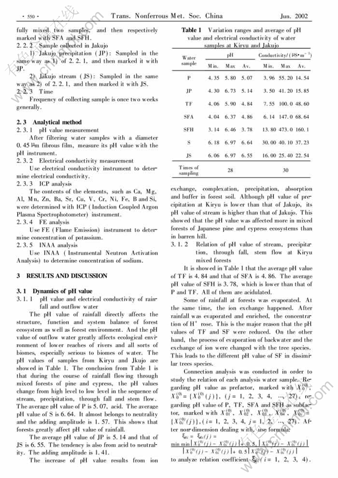 Dynamics of pH value and metal elements of rainfall within mixed forests in Japanese pine and cypress