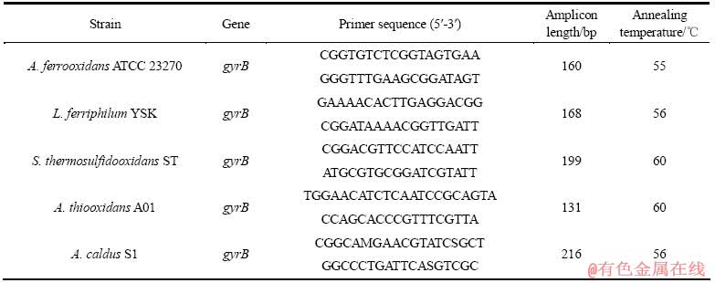 采用“Primer Premier 5.0”软件针对所用的5株浸矿细菌设计gyrB基因的特异性引物,然后由上海生工生物公司合成。各株细菌的特异性引物序列及相关信息如表1所列。