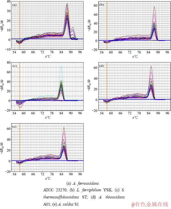 图1 所用5株浸矿细菌的Real-time PCR产物溶解曲线