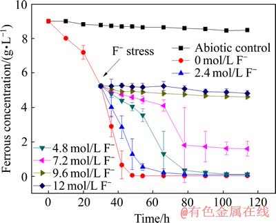 但是,该共培养体系在高浓度的氟胁迫下铁氧化速率抑制较为明显(见图3)。如图3所示,在2.4 mmol/L氟胁迫下,其铁氧化速率有所减缓,铁完全氧化时间延长了18 h左右;当4.8 mmol/L氟胁迫时,其铁氧化速率减缓很明显,铁完全氧化时间延长了30 h左右;当7.2 mmol/L氟胁迫时,亚铁已难以被完全氧化,当氟胁迫浓度高于9.6 mmol/L时,其铁氧化速率几乎停滞。单从铁氧化速率来说,共培养体系不如单一的铁氧化细菌[19],这可能是因为共培养体系的能源选择更多,不只有亚铁,还有硫作为能源,也许更多的细菌在利用硫来生长。