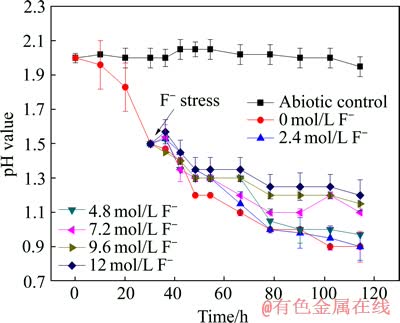 图4 所构建的共培养体系在不同浓度氟胁迫下的pH值变化