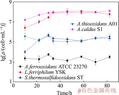 应用血细胞计数板计数来检测共培养体系的总菌量变化,进而通过Real-time PCR技术来定量各个菌株的生长变化。铁氧化速率通过重铬酸钾滴定Fe2+浓度来测定,硫氧化速率通过测定pH值来间接反映。根据不同细菌的生长周期合理取样,检测细胞个数与铁、硫氧化速率。应用数据制图分析软件Origin 8.0分析数据,得到共培养体系的总生长曲线与铁、硫氧化速率曲线。