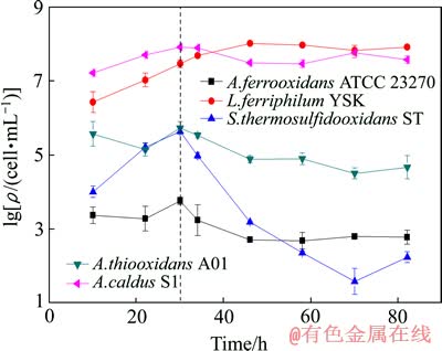本研究中所用的5株浸矿细菌(Acidithiobacillus ferrooxidans ATCC 23270, Leptospirillum ferriphilum YSK, Sulfobacillus thermosulfidooxidans ST, Acidithiobacills thiooxidans A01, Acidithiobacills caldus S1)的分离与培养参照文献[19]。将上述浸矿细菌等量混合组成,每株细菌的接种量为6×105 cell/mL。培养基为9K基本盐,加入44.7 g/L FeSO4·7H2O和10.0 g/L单质硫作为能源物质,培养温度为40 ℃,培养基pH值为1.8,摇床转速为175 r/min。
