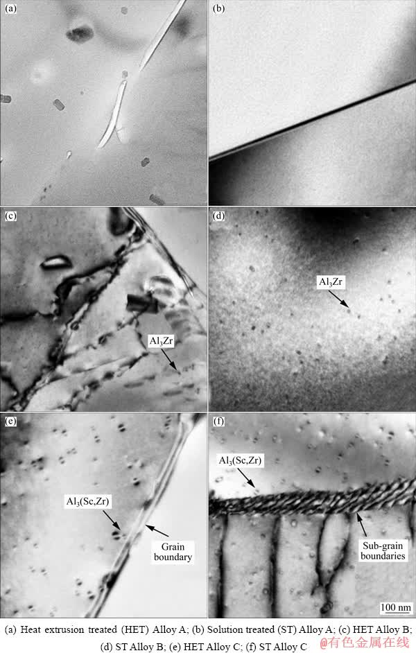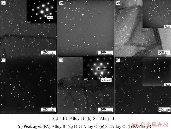 Figure 2 presents the dark field TEM images that show the distribution and size of the particles in Alloy B and Alloy C. It can be confirmed that these spherical particles are Al3Zr particles in Alloy B. Moreover, the Al3Zr particles pin the immigration of dislocations during HET. It is notable that the distribution of Al3Zr particles is not homogenous, especially near the grain boundaries, as seen in Figs. 2(b, c). Figure 2(d) shows that the second phase particles disperse homogenously in the matrix during HET in Alloy C. These particles are Al3(Sc,Zr) particles coherent with the matrix. Figure 2(f) shows that the Al3(Sc,Zr) particles still exhibit homogenous distribution after solution- aging treatment. These Al3(Sc,Zr) particles can effectively pin the grain boundaries and suppress the recrystallization during the heat treatment. Furthermore, the volume of Al3Zr particles is about 63% that of Al3(Sc,Zr) particles (Figs. 6(g, h)). However, compared with the Al3(Sc,Zr) particles, the distribution of the Al3Zr particles is not homogenous, especially near the grain boundaries.