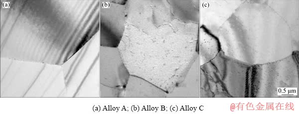The grain structures of the three (peak-aged) PA alloys are observed using TEM and the results are shown in Fig. 3. Compared with the microstructures of Alloy A in Fig. 3(a), the grain sizes are much smaller (Figs. 3(b, c)) in Alloys B and C. Moreover, the sub-grains and dislocation can also be seen in the solution-aging treated Alloy C. Hence, the substructures effectively remain and the grains are significantly refined due to the joint addition of Sc and Zr.