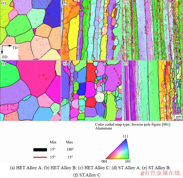 The EBSD images of the three HET and ST Al-Zn-Mg-Cu alloys are shown in Fig. 4. It can be seen that most of the grain boundaries of Alloy A, without Sc and Zr addition, are characterized by high angle grain boundaries, indicating that complete recrystallization has occurred in Alloy A after heat extrusion treatment (Fig. 4(a) and Fig. 5). HET Alloy B and Alloy C exhibit highly elongated grain structures along the extrusion direction, with a large number of fiber-like structures consisting of sub-grains characterized by low angle grain boundaries as shown in Figs. 4 (b, c). Figure 4(d) shows that coarse grains are the dominant grain structures in Alloy A, with mean grain size of (27±8) μm after ST. Figure 4(e) illustrates that the elongated grain structures disappear and apparent recrystallization occurs in Alloy B after ST. Compared with the ST Alloy A, the mean grain size in the ST Alloy B decreases from (27±8) to (14±7) μm when modified with 0.1% Zr. Figure 4(f) presents the grain structures of Alloy C after ST. Different from the ST Alloy A and Alloy B, the mean grain size further decreases to (6±5) μm in Alloy C modified with 0.07% Sc and 0.07% Zr after ST. Additionally, the grain structures of Alloy C present a mixture of highly elongated grains and fiber-like structures. Ultrafine equiaxed grains along the ED are observed in Alloy A after ST, indicating the occurrence of partial recrystallization. The above results demonstrate that joint addition of 0.07% Sc and 0.07% Zr leads to the formation of dispersive Al3(Sc,Zr) particles which effectively inhibit the recrystallization. Meanwhile, the addition of 0.10% Zr is less effective in terms of inhibiting recrystallization compared with the joint addition of Sc and Zr (Fig. 5), and many elongated structures can be seen in the matrix of Alloy C.