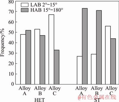 Fig. 5 Misorientation angle distributions in three alloys with different treatments