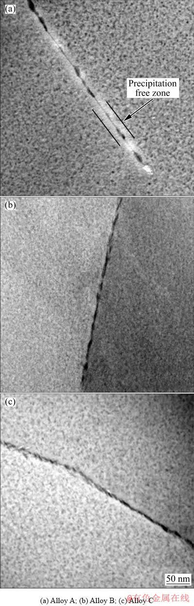 The TEM images of aging precipitates in the three alloys under different conditions are shown in Fig. 6. Many η-MgZn2 precipitates homogenously disperse within the grains in PA alloys. It is notable that the coarse rod-like aging precipitates segregate at the grain boundaries and the width of the precipitation free zones is 33 nm (Fig. 6(a)). The precipitates along the grain boundaries are continuous in Alloys B and C, but there are almost no differences in the distribution and coarsening degree of phases within the grains (Figs. 6(b, c)). Moreover, the precipitates of Alloy C at the grain boundaries are finer than those of Alloy B. Therefore, it can be inferred that the additions of Sc and Zr have no effects on the size and density of the aging precipitates within the grains. Nevertheless, aging precipitates are markedly refined and the width of the free precipitation zones is reduced along the grain boundaries.